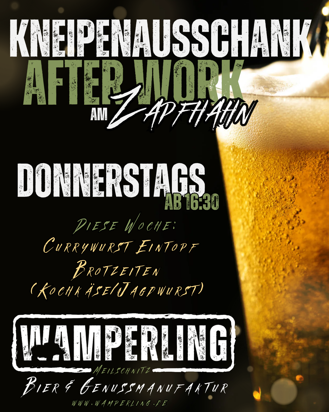After-Work-Feierabendschoppen, klassischer Ausschank, entspannte Stimmung und wechselnde Snacks.